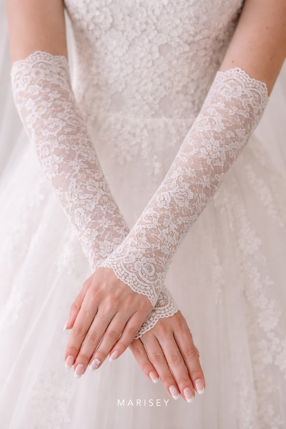 Subtelne bezpalcowe rękawiczki ślubne wykonane z delikatnej koronki Chantilly to elegancki i ponadczasowy dodatek do stylizacji panny młodej. Lekka, półtransparentna koronka z romantycznym, falowanym wykończeniem pięknie układa się na dłoniach i ramionach, dodając całości lekkości i kobiecego wdzięku.